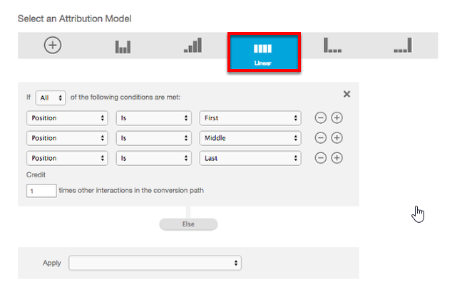 Located under the "Apply" drop down, a fallback Attribution Model will need to be selected for the scenario where a user does not have more than two touch points prior to a conversion.