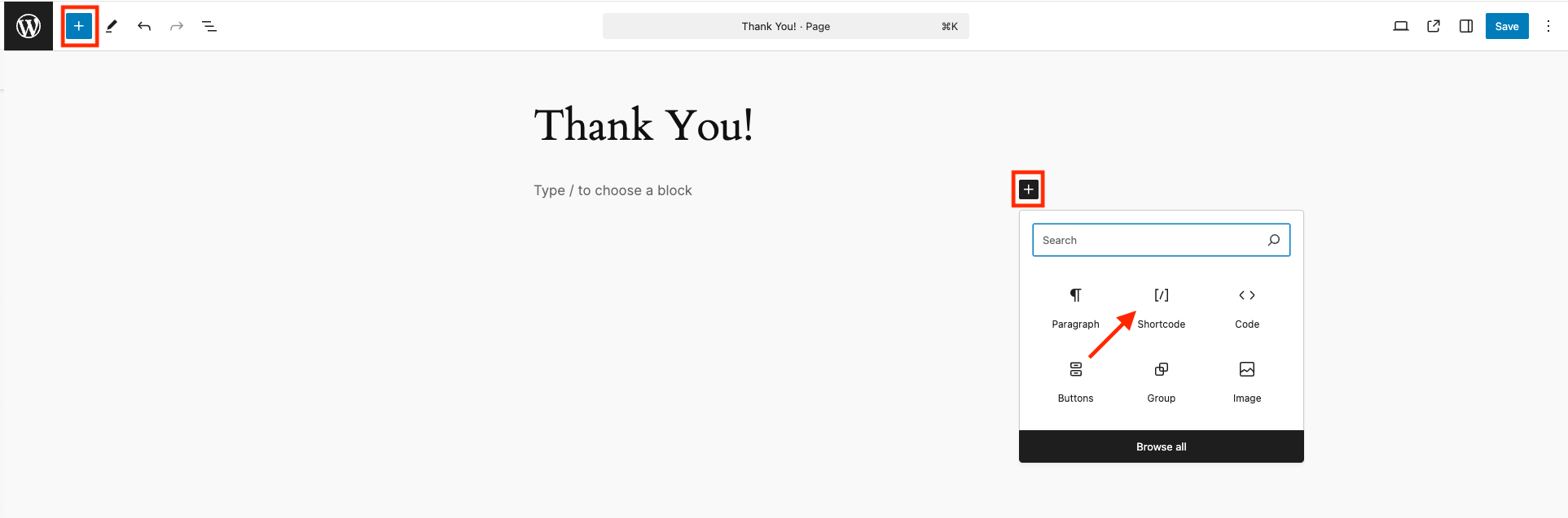 - Click on the associated icon and add the shortcode anywhere on your thank you page