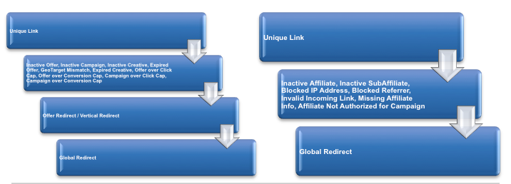 There are several circumstances that would either cause a user to be redirected to the Offer Redirect or directly to the Global Redirect. The user will redirect to the Vertical Redirect if no Offer Redirect is present. The Offer and Vertical Redirect are Offers whereas the Global Redirect is simply a link.